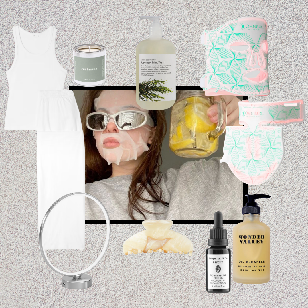 Pyjama set, SKIN. Candle, Mala. Wash, Saltspring Soapworks. LED mask + neck, both Omnilux. Oil cleanser, Wonder Valley. Face oil, Sangre de Fruta (ps they're having a sale). Claw, Kōv. SAD lamp, Kala.
